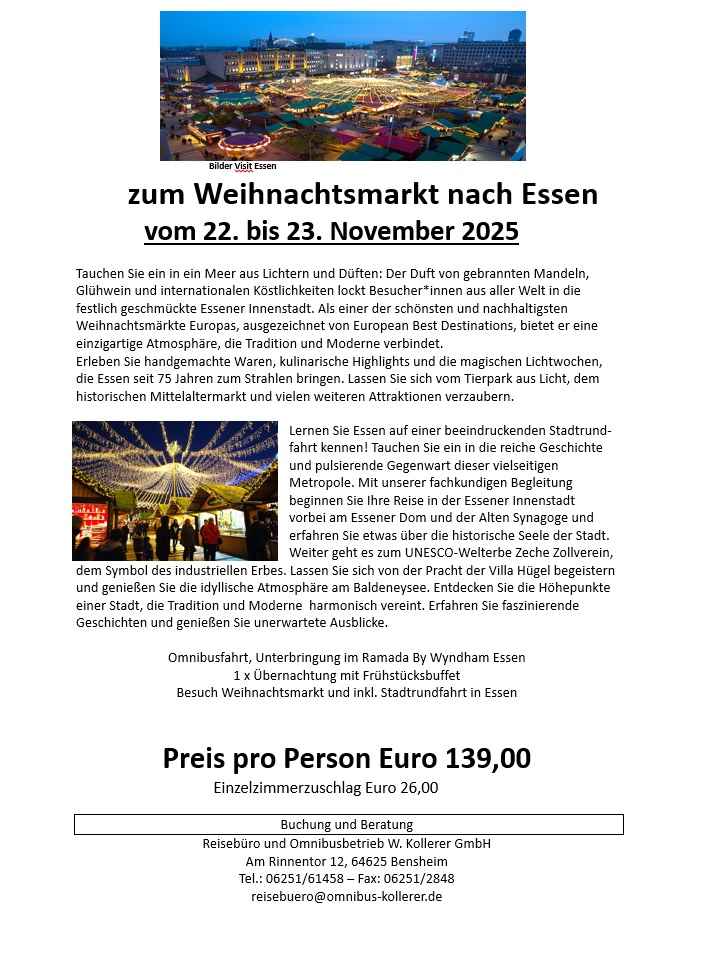 Wir bringen Sie in modernen Reisebussen zu den schönsten Städten und Sehenswürdigkeiten in Deutschland und Europa. Ob Vereinsausflug, Betriebsausflug, Seniorenreise, Studienfahrt, Klassenfahrt oder Tagesausflug – wir organisieren Ihre Busreise ganz nach Ihren Wünschen. Sagen Sie uns einfach, was Sie sich vorstellen, und wir machen Ihnen ein individuelles Angebot.